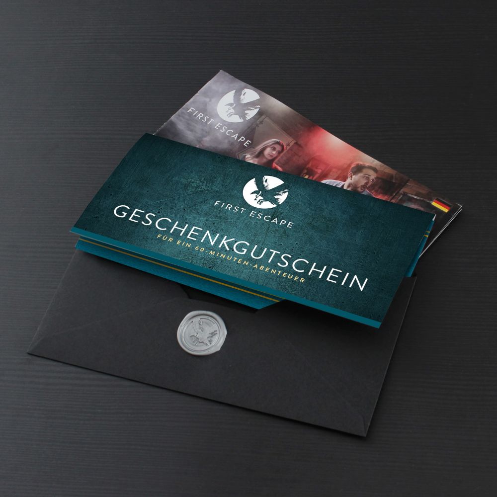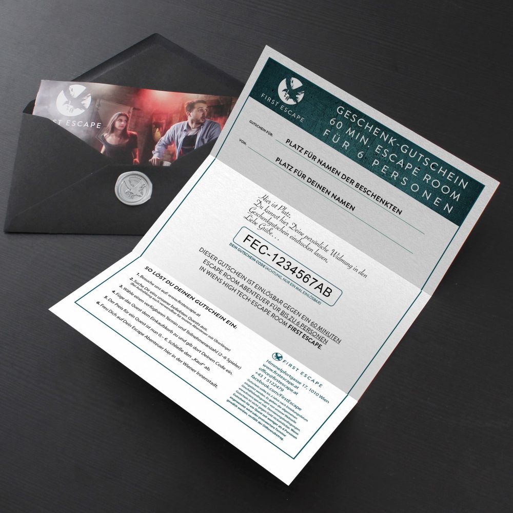Eine Alternative zur Buchung fixer Termine sind unsere offenen Geschenkgutscheine. Der/die Beschenkte kann damit über einen individuellen Gutscheincode frei einen verfügbares, beliebiges 60-minütiges Escape Room Quest in beliebiger Gruppengröße (bis max. 6 Personen) buchen. Etwaige Differenzen bei Anwendung des Gutscheins auf kleinere Gruppengrößen oder preiswertere Termine verfallen.
