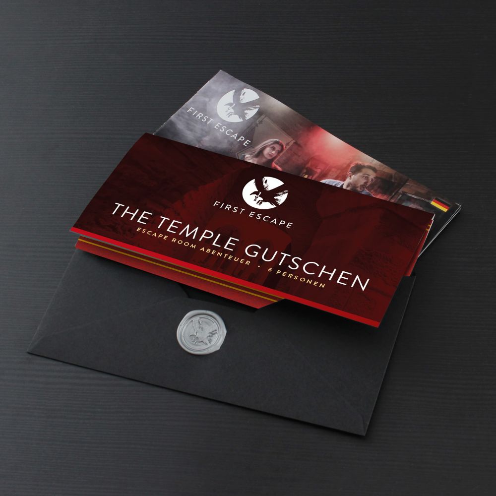 Eine Alternative zur Buchung fixer Termine sind unsere offenen Geschenkgutscheine. Der/die Beschenkte kann damit über einen individuellen Gutscheincode frei einen verfügbaren Termin in dem Escape Room THE TEMPLE in beliebiger Gruppengröße buchen. Etwaige Differenzen bei Anwendung des Gutscheins auf kleinere Gruppengrößen oder preiswertere Termine können nicht erstattet werden.